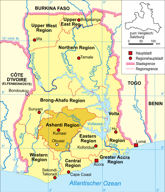 Ghana (i/ˈɡɑːnə/), officially called the Republic of Ghana, is a sovereign unitary presidential constitutional democracy, located along the Gulf of Guinea and Atlantic Ocean, in the subregion of West Africa. Spanning a land mass of 238,535 km2,